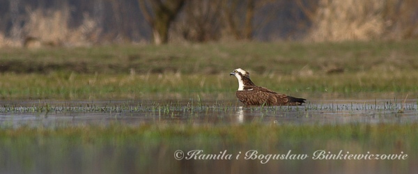 Koniec marca i początek kwietnia spędziliśmy w znacznej mierze na łąkach w dol. Pilicy koło Szczekocin. Kolejne dni przynosiły coraz to lepsze i ciekawsze obserwacje, stwierdziliśmy min. żurawie, bieliki, błotniaki zbożowe, rybołowa czy słonkę. Początkowo prowadziliśmy obserwacje głownie na stawach, okazało się jednak iż na łąkach w paru miejscach utworzyły się po roztopach rozległe rozlewiska. Nad największym z nich skupiała się spora ilość ptaków wodono-błotnych, w polbliżu miała swój rewir para żurawi a na dokładkę codziennie około południa na środku rozlewiska kąpał się rybołów po czym leciał na pobliskie drzewo gdzie suszył skrzydła i dłuższy czas odpoczywał. Szybko zapadła decyzja, następnego dnia stała już buda po czym daliśmy zwierzakom kilka dni na przyzwyczajnienie do nowego obiektu. Po tym czasie nastąpił okres baaaardzo wczesnego wstawiania, dojazdów i siedzenia, siedzenia i jeszcze raz siedzenia. Rano zawsze we znaki dawał się przymrozek, około południa trzeba było się już rozbierać bo w budzie grzało mocno a na dodatek przemakała podłoga. W ukryciu częstymi gośćmi były żaby których w rozlewiskach pluskało się całkiem sporo, raz odwiedził nas ciekawski szpak no i po paru dniach zjawił się w końcu właściciel łąki, zaciekawiony naszym ukryciem. Po upewnieniu się że nie jesteśmy z Unii Europejskiej dał nam wolną rękę na robienie zdjęć i czatownie. Jednak mimo wymienionych drobnych problemów samo czatownie było bardzo udane, z rozlewisk korzystało naprawdę sporo różnych gatunków. Nawet rybołów przylatywał na codzienną kąpiel i dobrze pozował na swoim ulubionym drzewie :)